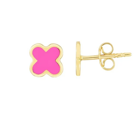SOLID 14K Gold Clover Enamel Earrings, Thinner Push Back Studs Woman, Blue Yellow Green Pink