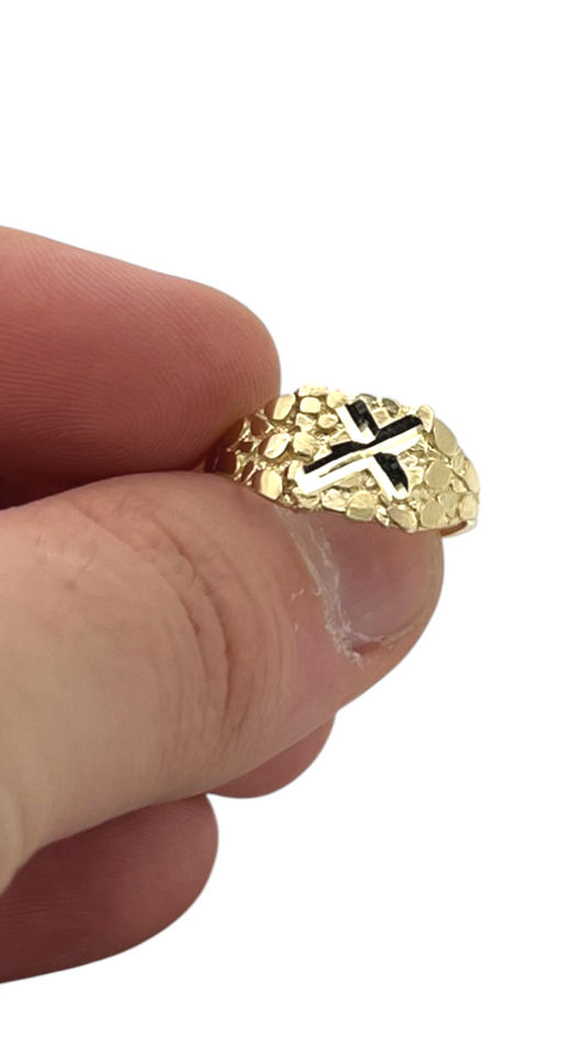 10K Yellow Gold Nugget Ring with Diamond-Cut Cross - Religious Ring - Varation Styles