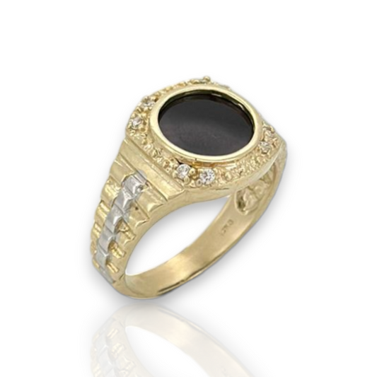 Railroad Round CZ Black Onyx Signet Ring - 10K Yellow Gold