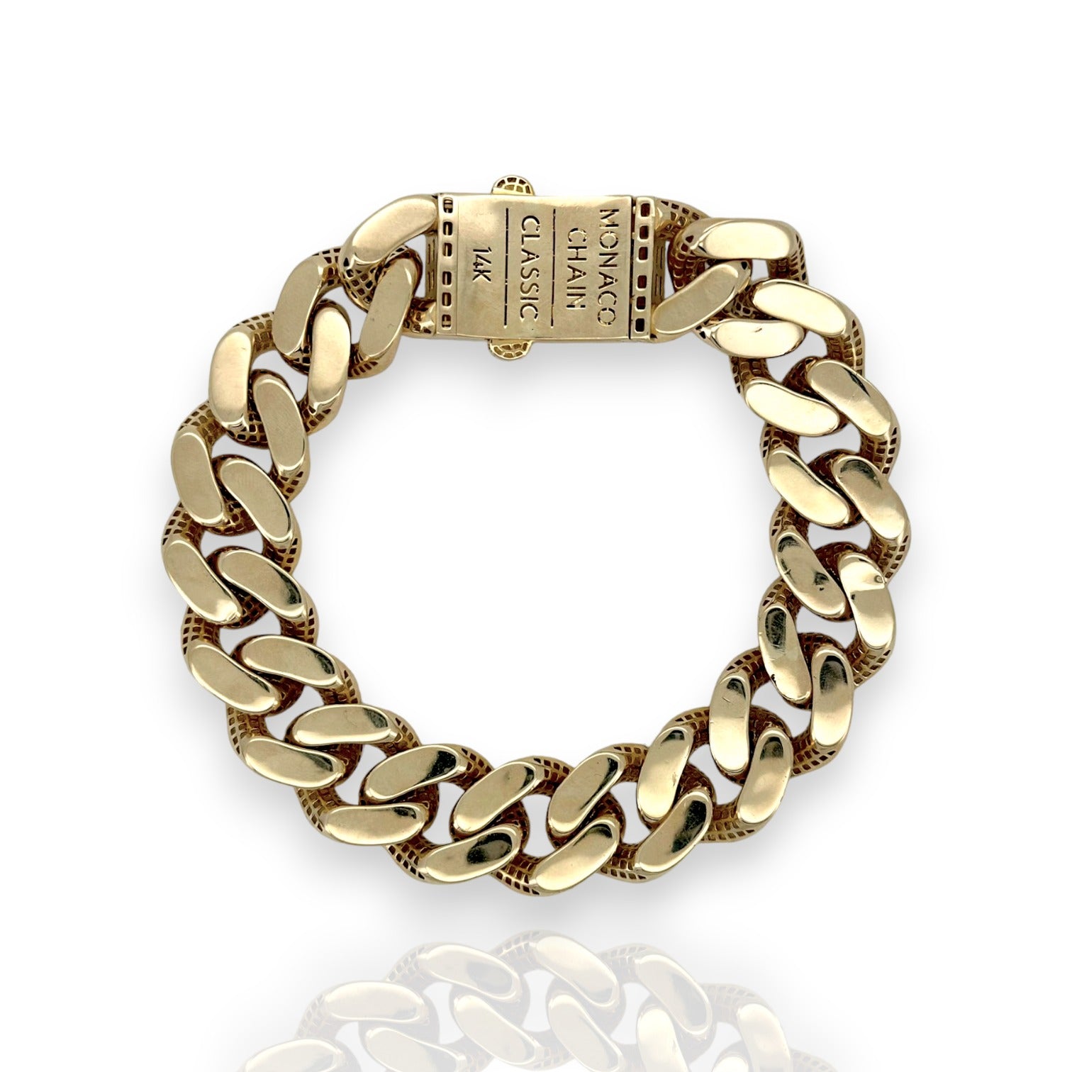 Introducing our Monaco Chain Miami Cuban Royal Link CZ Lock Bracelet in 14K Yellow Gold—a regal and dazzling accessory that marries the iconic Miami Cuban link design with the brilliance of CZ (Cubic Zirconia) stones and a secure lock, all crafted with a hollow construction for a comfortable and stylish wear.